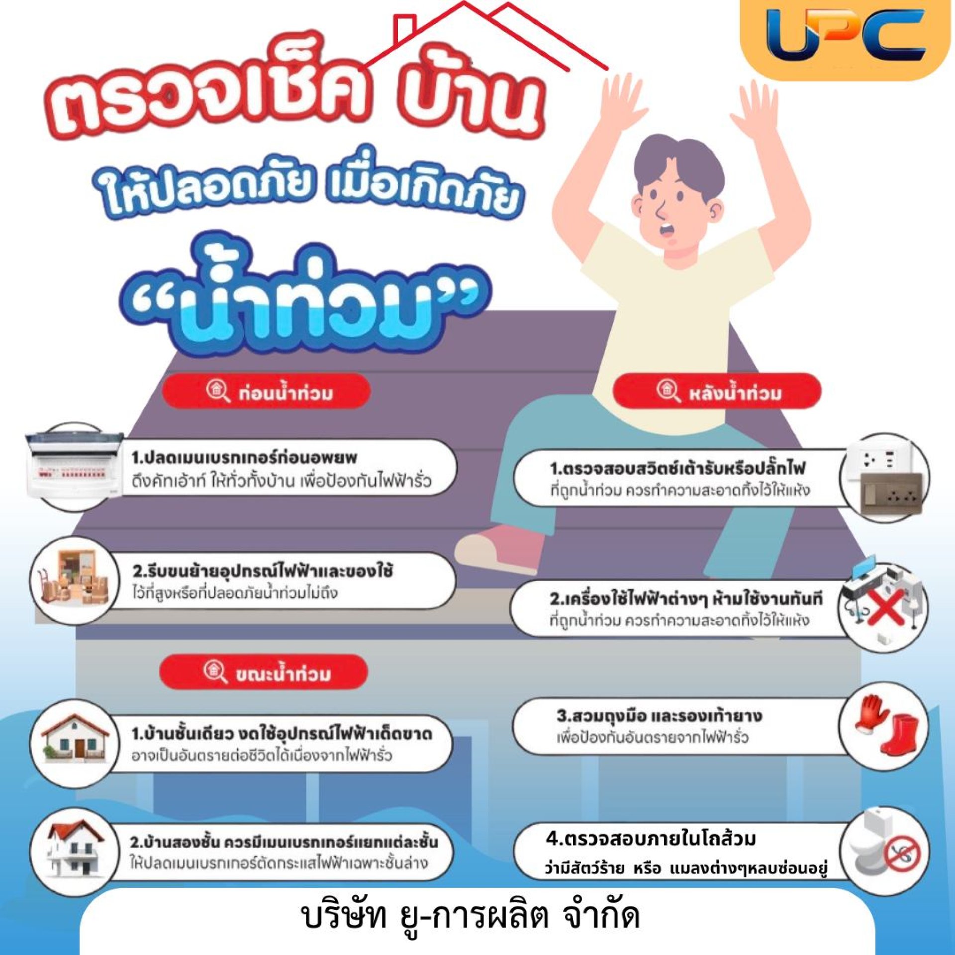 - รีบขนย้ายอุปกรณ์ไฟฟ้าและของใช้ ไว้ที่สูงหรือที่ปลอดภัยน้ำท่วมไม่ถึง
